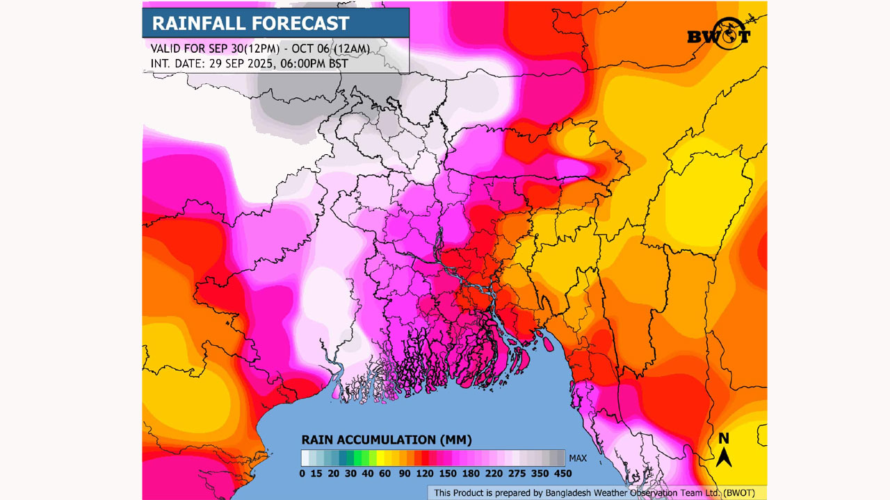 সংস্থাটি আরও জানায়, বৃষ্টিবলয় ৩০ সেপ্টেম্বর রাতে দেশের পূর্ব দিক দিয়ে প্রবেশ করে ৬ অক্টোবর রংপুর বিভাগ দিয়ে দেশ ত্যাগ করতে পারে। এই সময়ে একটানা ও দীর্ঘস্থায়ী বৃষ্টির সম্ভাবনা রয়েছে, বিশেষ করে যেসব এলাকায় এর প্রভাব বেশি।